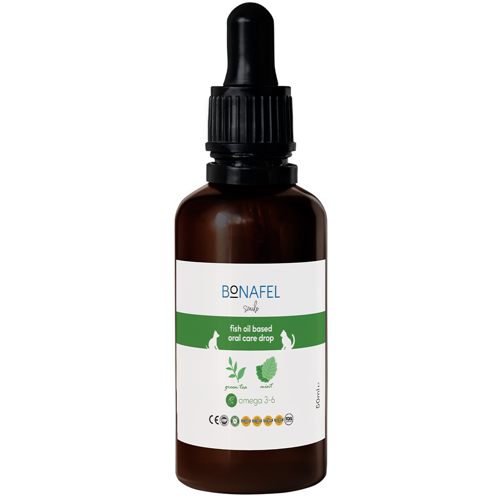 Fish oil Based Oral Care Drop, sıvı formdadır ve damlalıklı bir ambalaja sahiptir.