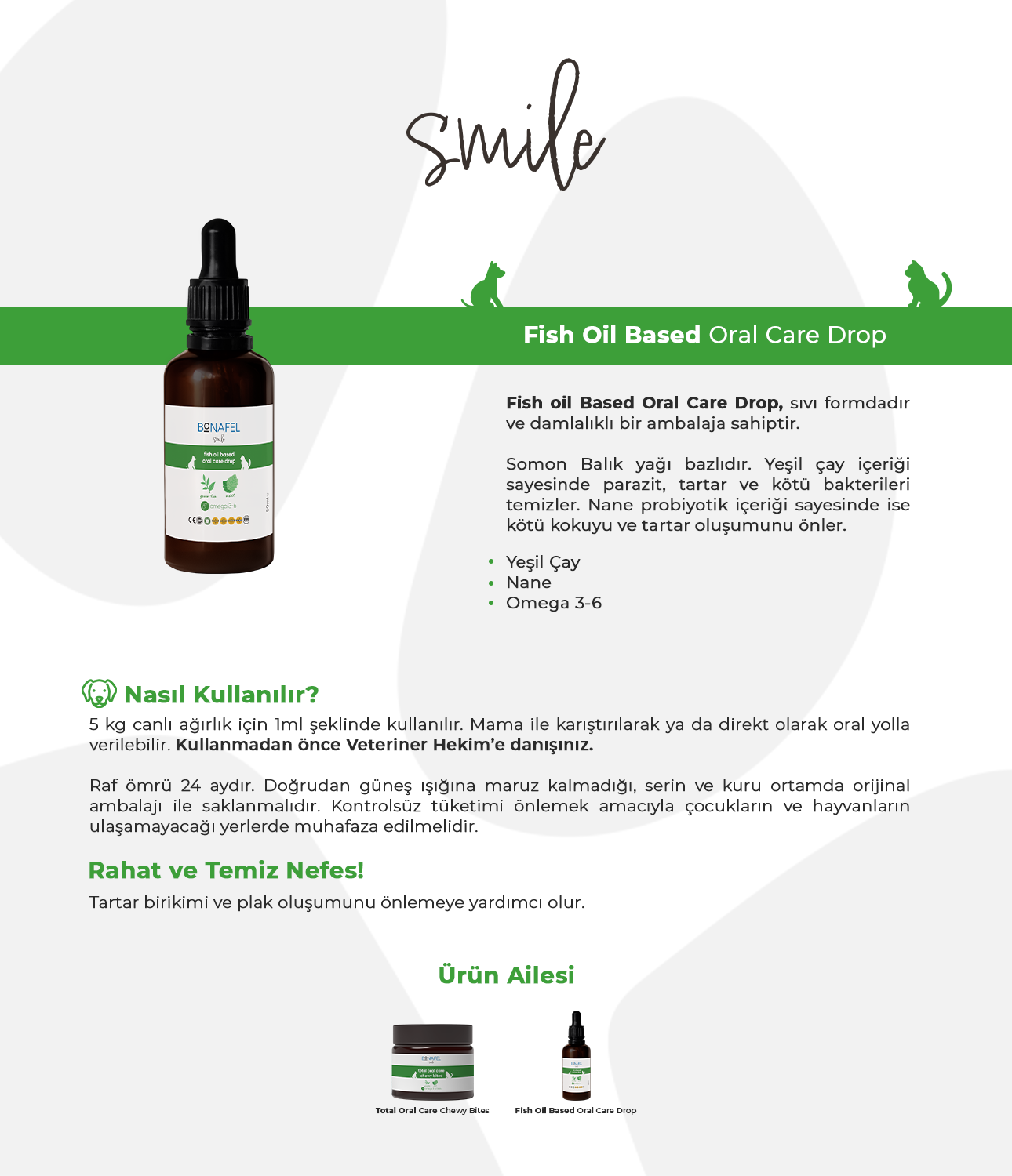 Somon Balık yağı bazlıdır. Yeşil çay içeriği sayesinde parazit, tartar ve kötü bakterileri temizler. Nane probiyotik içeriği sayesinde ise kötü kokuyu ve tartar oluşumunu önler.