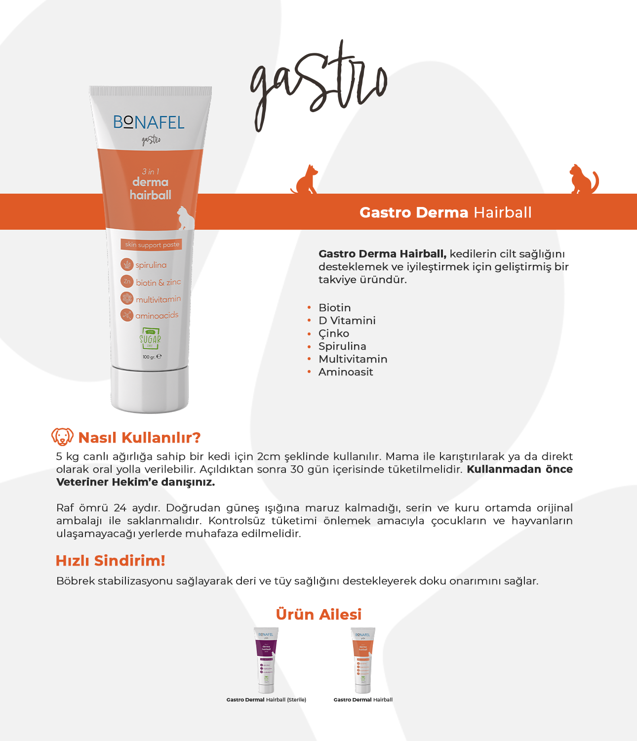 Gastro Derma Hairball, kedilerin cilt sağlığını desteklemek ve iyileştirmek için geliştirmiş bir takviye üründür.